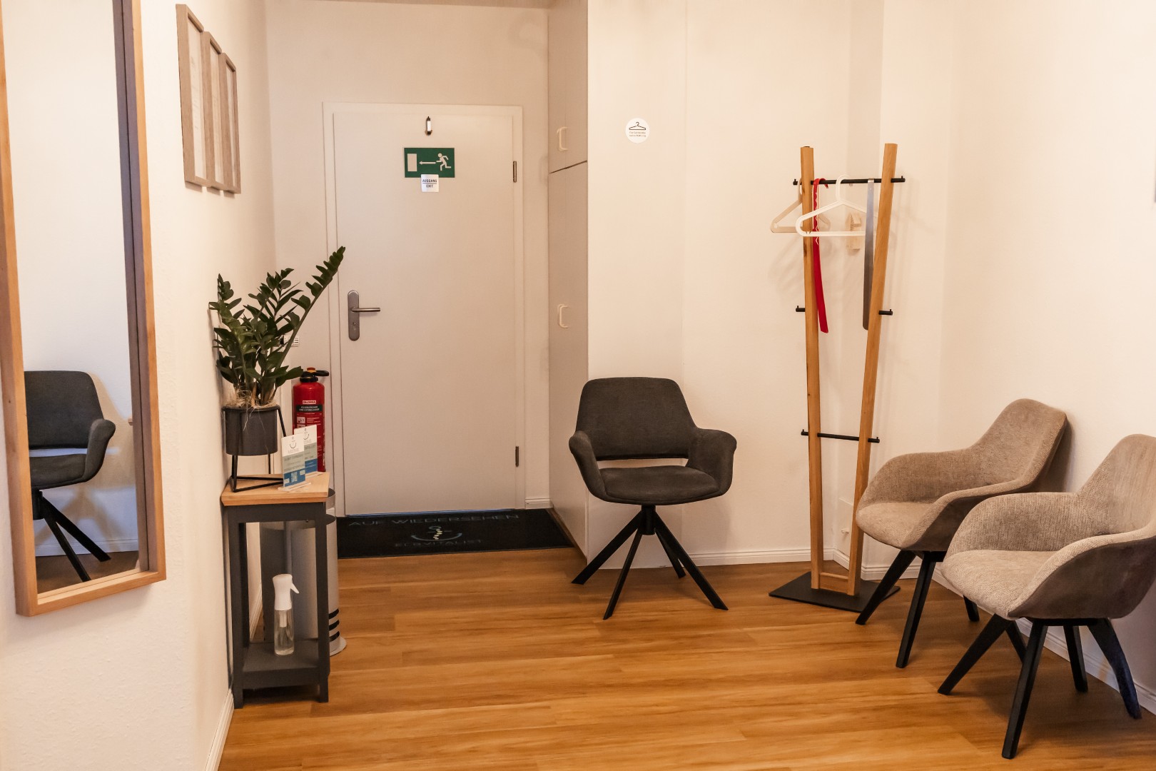Dich begrüßt ein einladender Flur- & Wartebereich und eine modern ausgestattete Anmeldung.